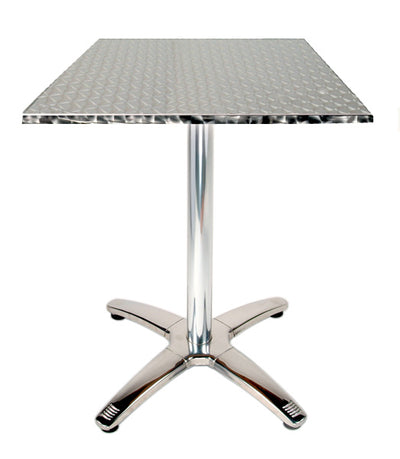 One piece stainless steel surface has integral die formed lip that does not trap food or liquids. Surface is permanently polished in circular pattern. Die cast aluminum spider fastens to man made treated wood product core in top. Column is anodized, bright polished aluminum. Base is powder coated cast iron with polished stainless steel clad cover. Screw-in adjustable plastic based glides are suitable for use on all surfaces.
