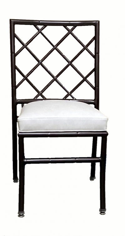 Model 3000 is a classic lattice back chair preferred by 5-star hotels for dining and banquet facilities as well as country clubs. The chair is available with both the fully open lattice back (style 3000) or upholstery on the front back showing the lattice on the back side of the chair (Style 3010). The sewn seat cushion features 2 1/4” of luxurious foam for extended comfort. The all-welded aluminum frame is fabricated from one inch round, 1/10th wall (25mm/2.4mm) extruded tubing with bamboo ringing design. The frame is structurally reinforced to ensure many years of contract service. The back lattice Chinese Chippendale design is created from 30 individually welded and polished aluminum spindles 1/2” round (12mm). The legs are fitted with rubber cushioned triple umbrella clip glides and plated steel base for years of maintenance free use on all floor surfaces. A formed metal “seat pan” beneath the seat cushion prevents indentations in the fabric when chairs are stacked for movement or storage. All foam cushioning meets the flammability standards of California Bulletin 117.